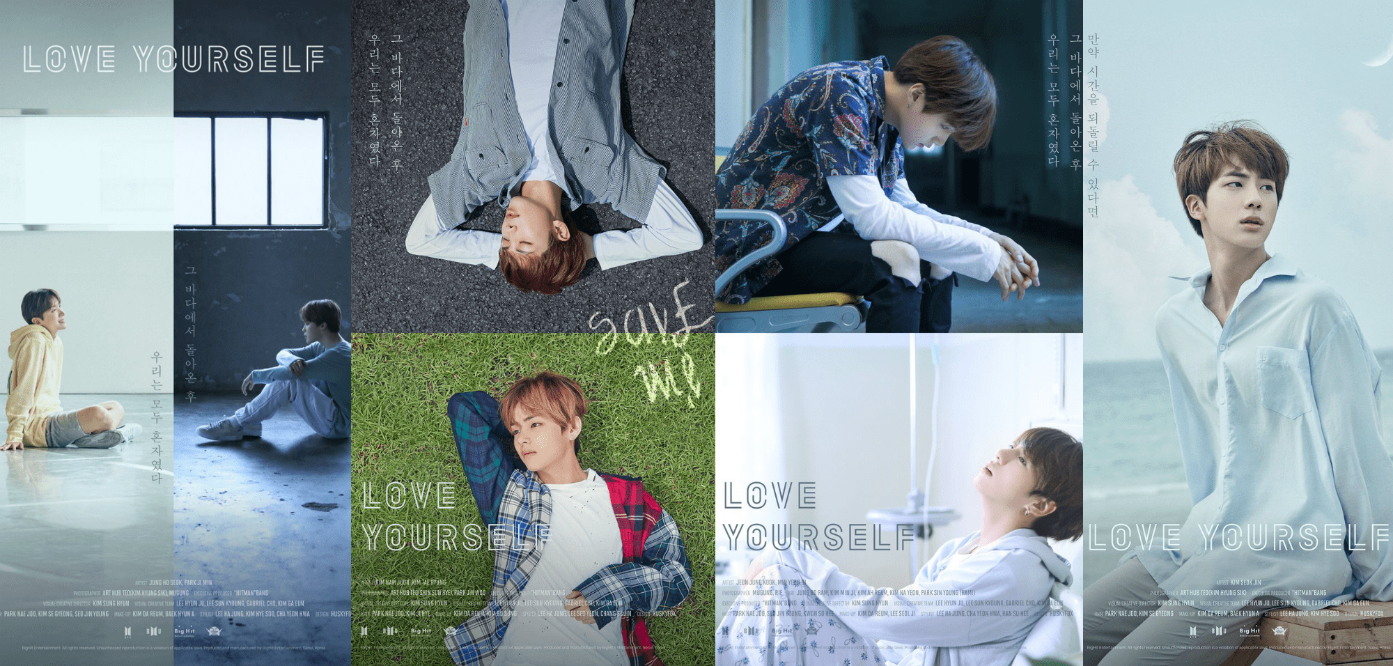 Each poster included the sentence: “After coming back from that sea, all of us are alone.” Note that additionally, in RapMonster and V’s poster, the phrase “Save me” scrawled on the pavement and grass also says “I’m fine” when read upside down.
