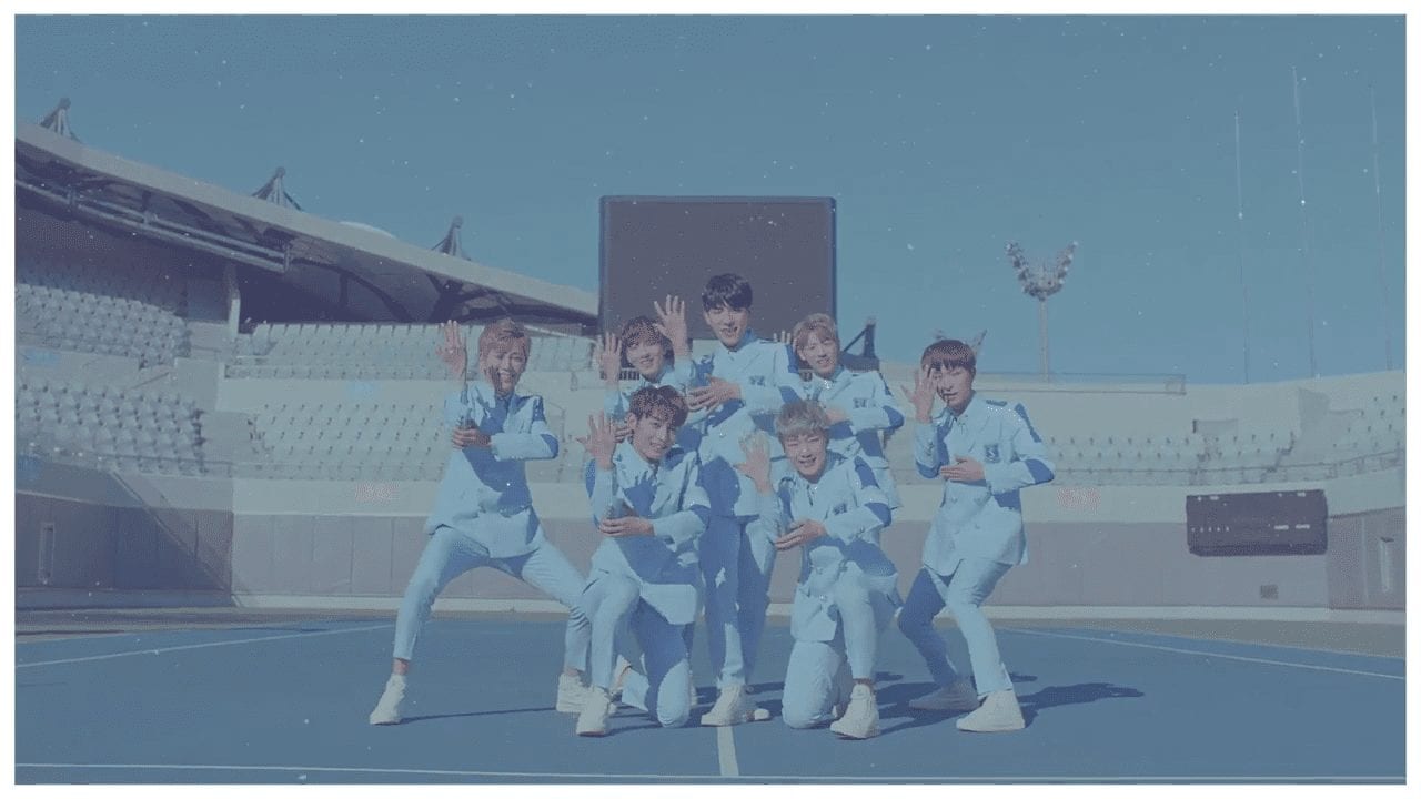 The teaser shows the seven-member group as innocent school boys in the daytime and aspiring band members as night. They look fresh and charming in white and blue suits, showing off a cute dance number. The song itself is the title track for their debut album. The track is upbeat and catchy, with a slightly retro pop feel reminiscent of earlier Kpop groups like SS501.