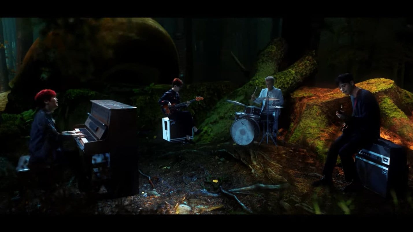 Meanwhile, the band is seen in a variety of mysterious and fantastical settings, including an enchanted forest where sea animals swim by in the air.
